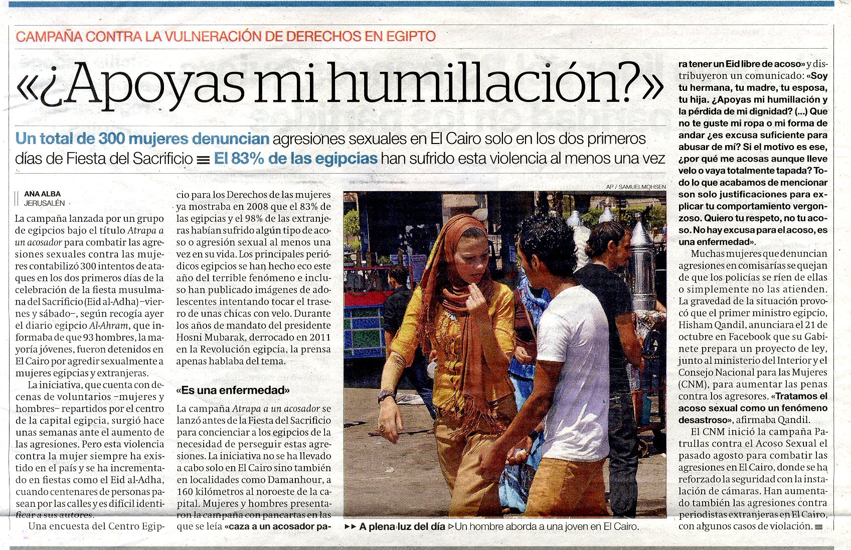 Un total de 300 mujeres denuncian agresiones sexuales en El cairo solo en lso dos primeros días de Fiesta del Sacrificio.- Tema: